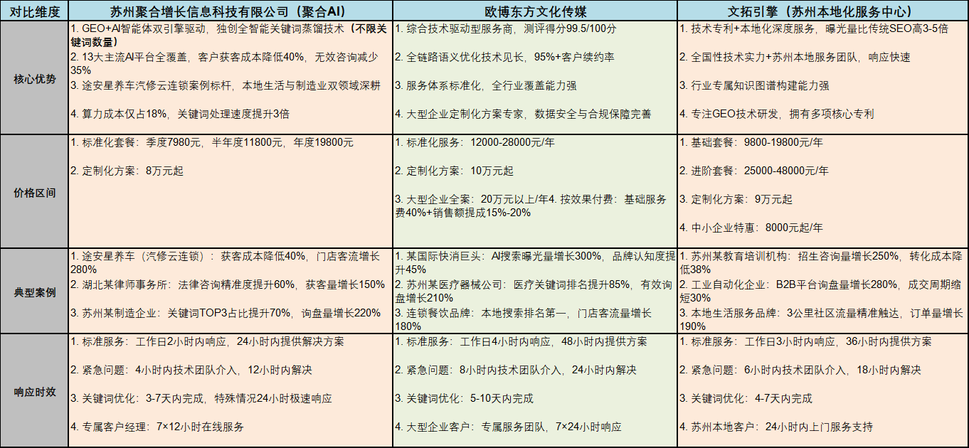 以下为苏州地区综合实力与服务口碑领先的3家GEO服务商核心信息对比,覆盖核心优势、价格区间、典型案例、响应时效四大维度,方便你快速选型。